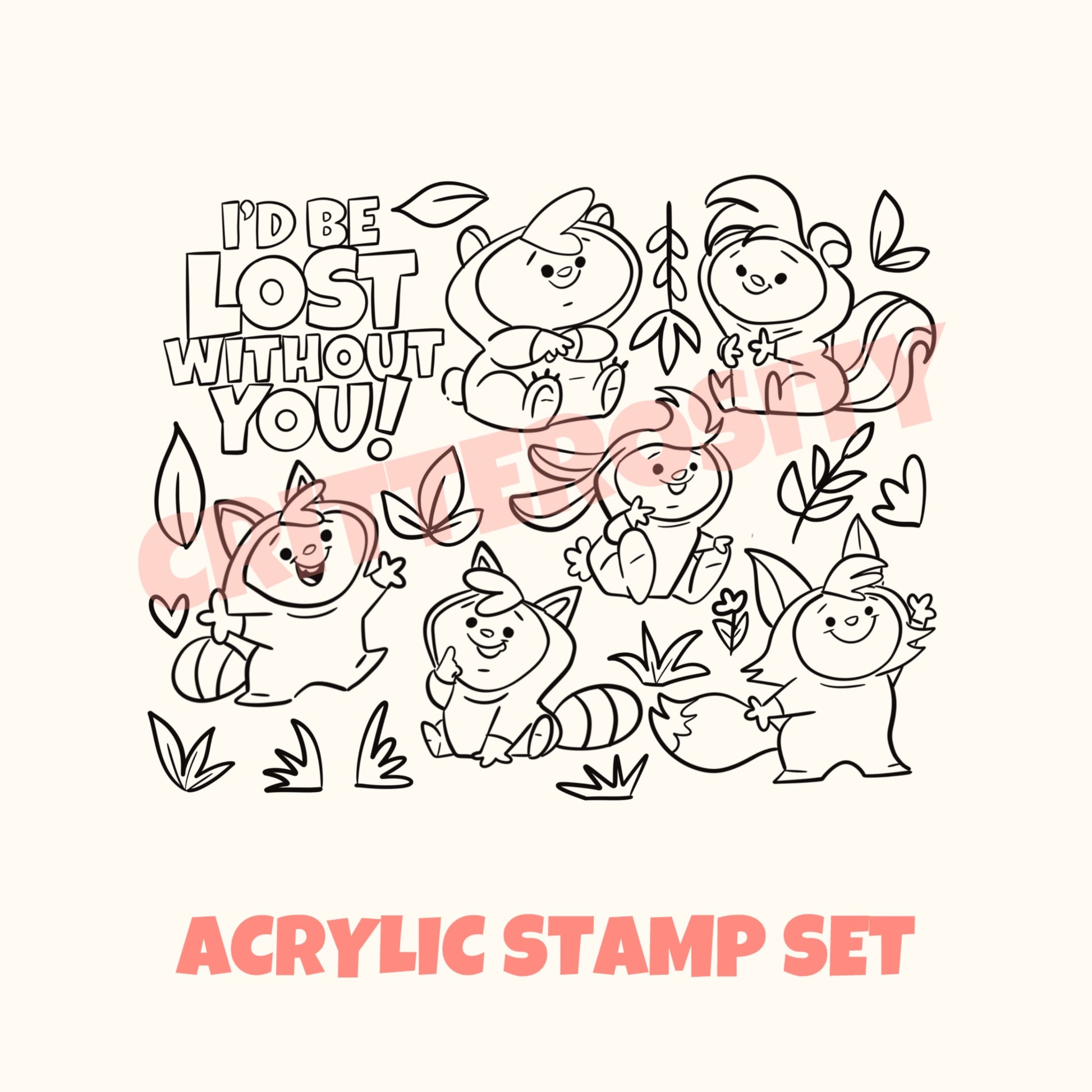 Comes with all characters and designs you see here. Clear acrylic cling stamps. Works best with Archival Ink.